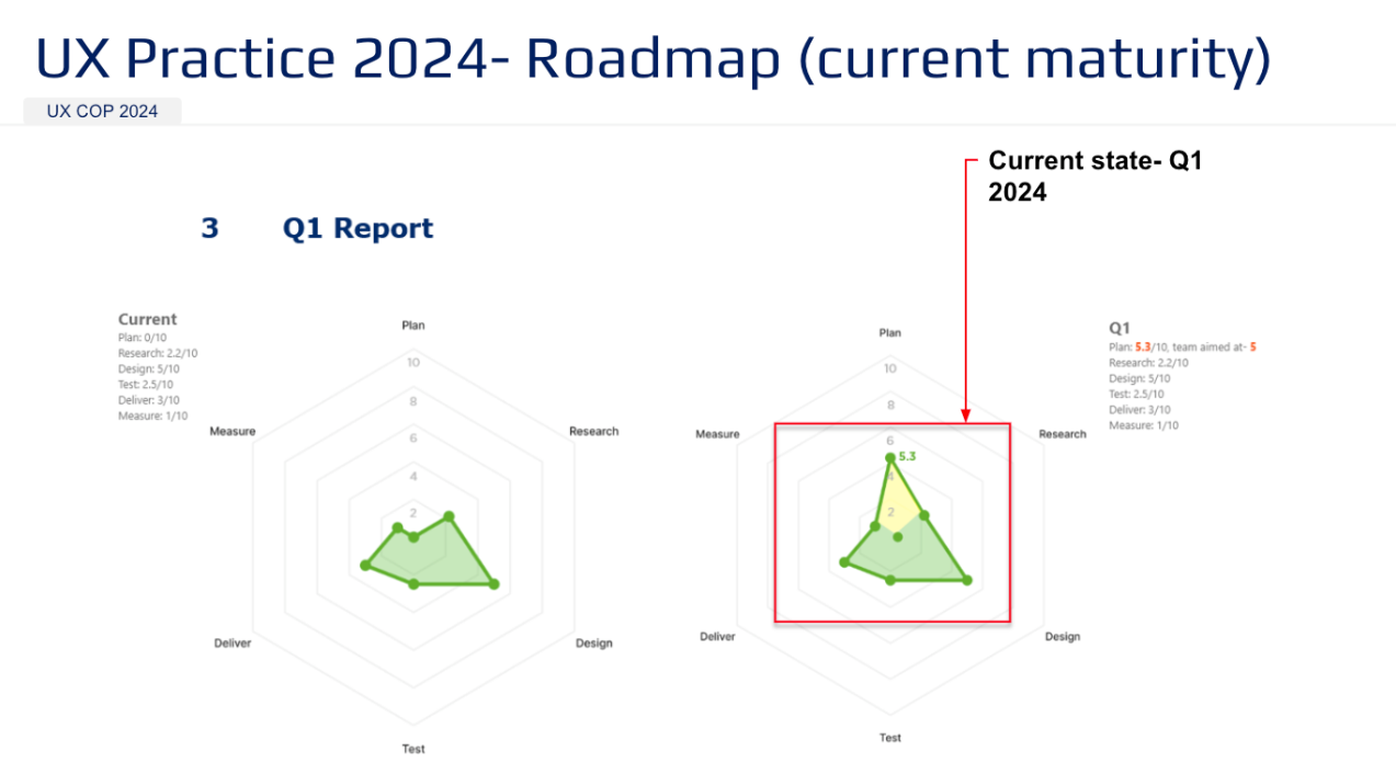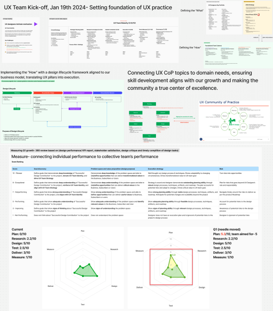 A strategic deck that communicated why UX exist in the org. and how the team actually designs, decides, and delivers value. Show UX maturity and roadmap.